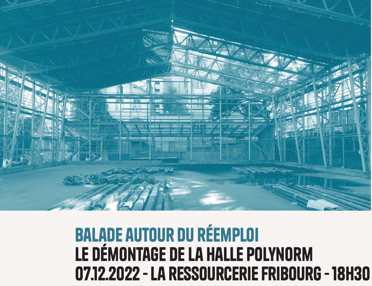 A l’occasion de son dernier événement de l’année 2022, l’association Architectes pour le climat souhaite donner un coup de projecteur sur un projet pilote en matière de réemploi et d’économie circulaire à Fribourg: le démontage de la Halle Polynorm. En partenariat avec l’institut TRANSFORM de la Haute école d’ingénierie et d’architecture, une balade guidée est proposée au sein de la Ressourcerie, ainsi qu’une projection musicale apéritive à la Halle Pop Up de Blue Factory avec Mahadev Cometo (Al Comet ou Alain Monod).