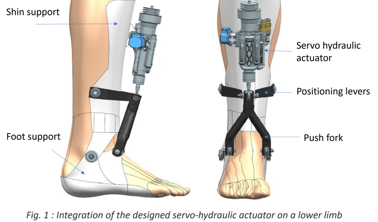 The aim of the project was to study the engineering feasibility of a motorized ankle-foot orthosis for use in rehabilitation therapy (s. Fig. 1 above). More specifically, the project focused on the development of a hydraulic actuation system for an ankle exoskeleton capable of delivering a peak power of 250 W, with a maximum torque of 90 N.m and a maximum angular speed of 320 degrees per second. The question we wanted to answer was “How far could we reduce the weight of such a hydraulically-operated orthosis without sacrificing dynamics or power?”