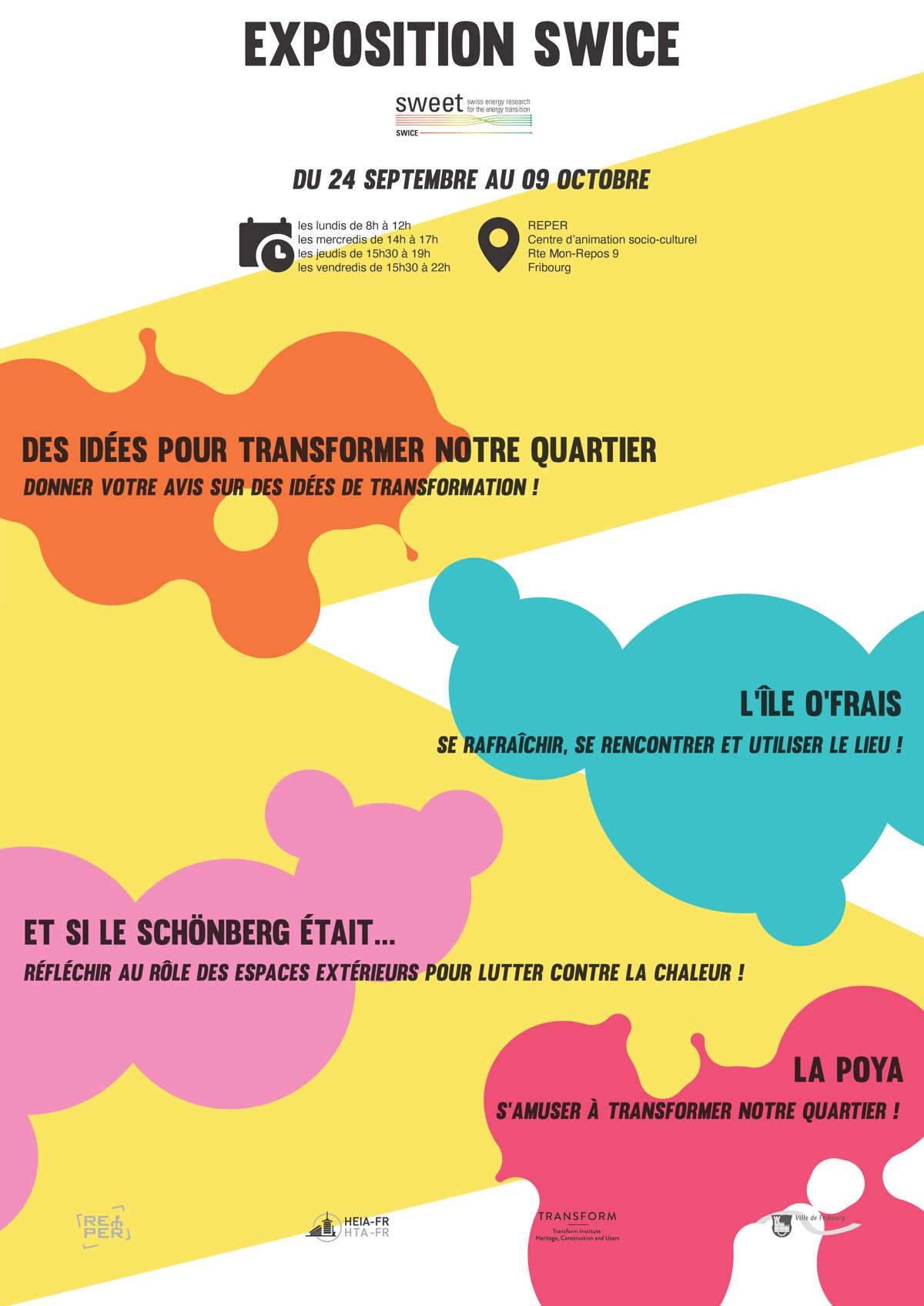Dans le cadre de la semaine pour le climat et la durabilité, l'institut TRANSFORM organise, en partenariat avec REPER et la Ville de Fribourg, une exposition en lien avec son projet SWICE. Une visite guidée mettant en lumière les résultats du projet sera prévue le jeudi 25 septembre 2025 de 17h30 à 21h.