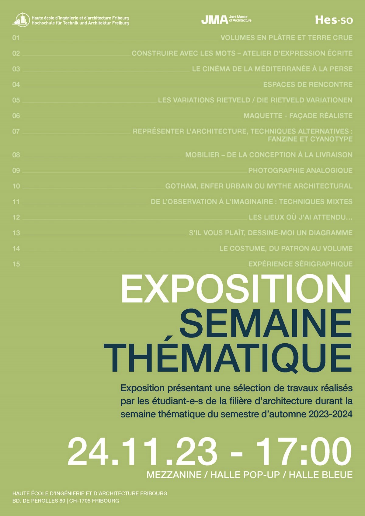 Cette exposition présente une sélection de travaux réalisés par les étudiant·es de la filière d'architecture durant la semaine thématique du semestre d'automne 2023-24.