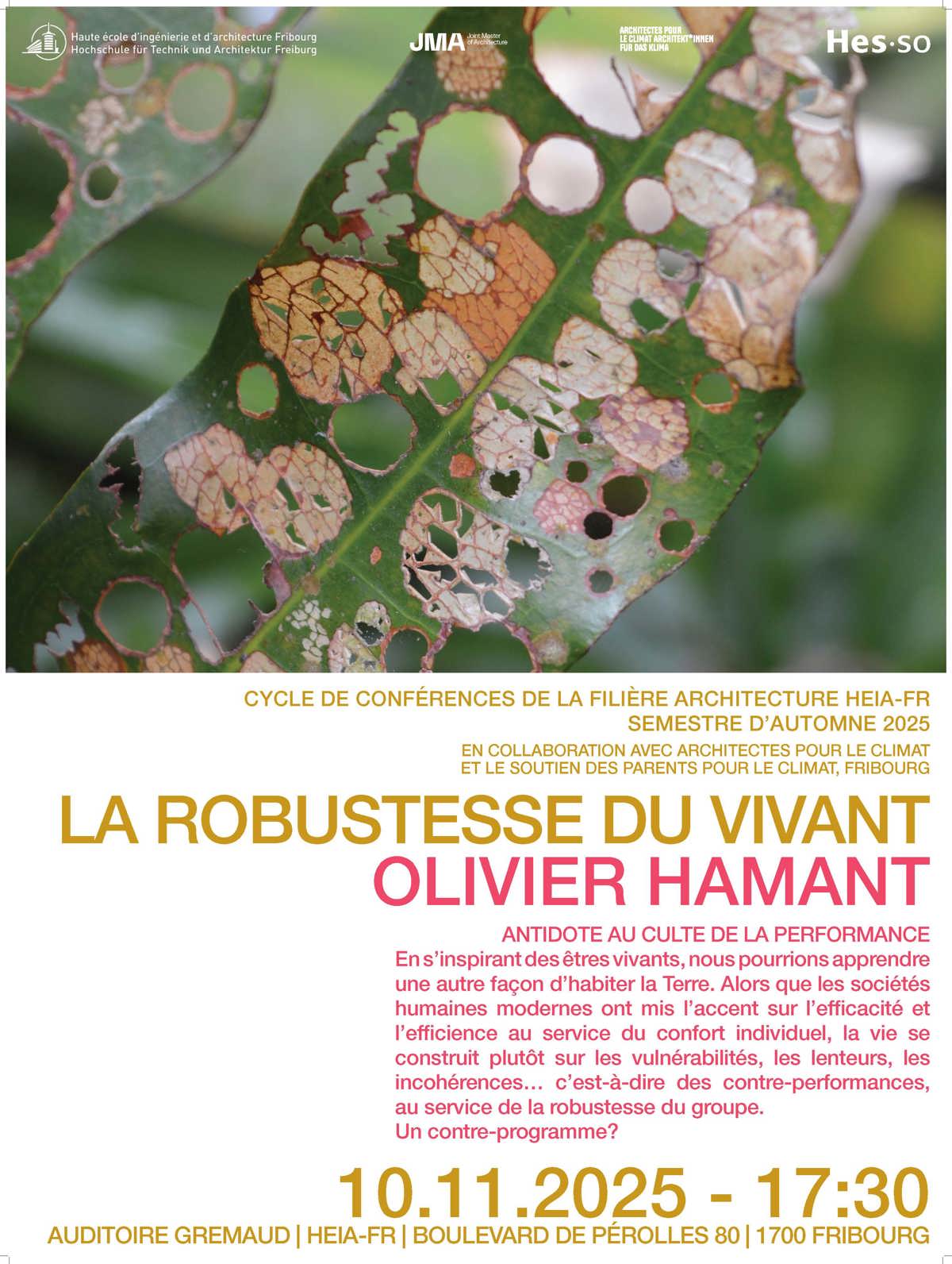 Olivier Hamant explorera cette thématique lors de la prochaine conférence de la filière d'architecture de la HEIA-FR, proposée en collaboration avec Architectes pour le Climat et le soutien des Parents pour le Climat Fribourg.