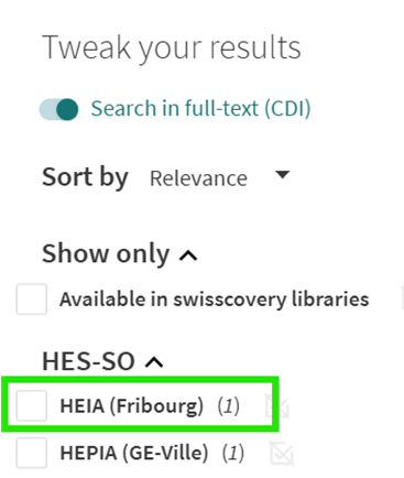 Once you have completed your search, you can also use the filters on the left of the page to search for books by various criteria, for example by library. To find books from our library, select HEIA (Fribourg) in the ‘HES-SO’ filter: