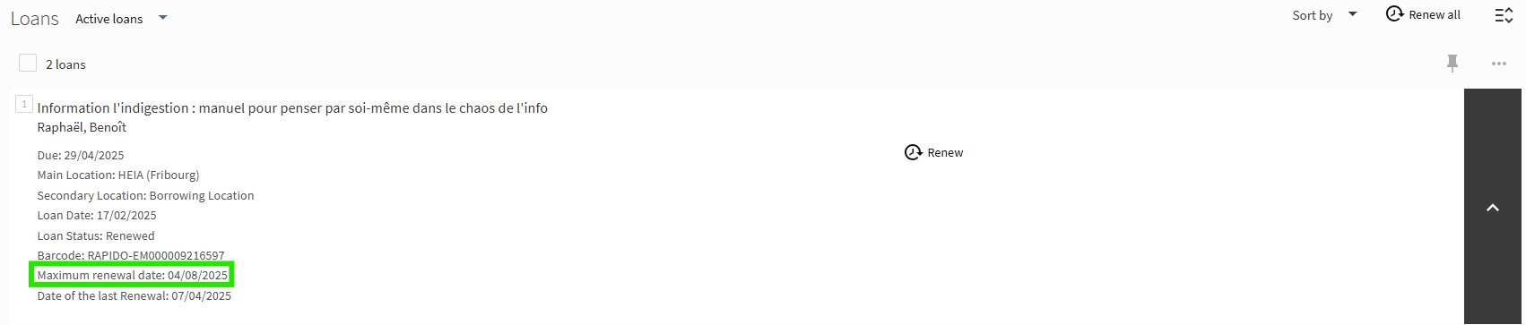 Note that borrowed documents are generally loaned for 28 days and automatically renewed up to five times, unless they are requested by another person. The maximum renewal date corresponds to the final expiry date of a loan (including all possible renewals).