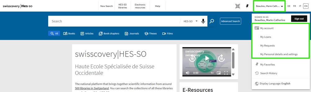 You log in to your account from the swisscovery|HES-SO homepage, by clicking on "Sign in/Register" in the top right-hand corner. Use your SWITCH edu-ID informations to sign in. You will then be redirected to the catalogue, and your name will appear in the top right-hand corner. To change your personal details, view the status of your document requests or extend your loans, click on your name and then select the relevant option.