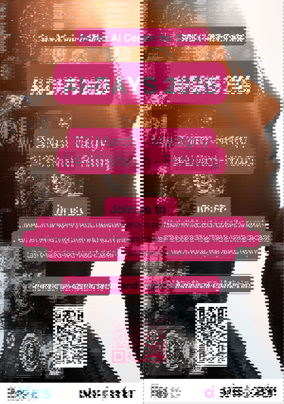 Le Swiss AI Center for PMEs et la HES-SO organisent trois journées d'ateliers et de conférences dédiés aux applications pratiques de l'intelligence artificielle pour les PME. Cet événement réunit les professionnel·les du domaine, les chercheurs et chercheuses en IA et les ingénieur·es de la HES-SO pour explorer des cas d'usage des technologies de machine learning et d'intelligence artificielle.