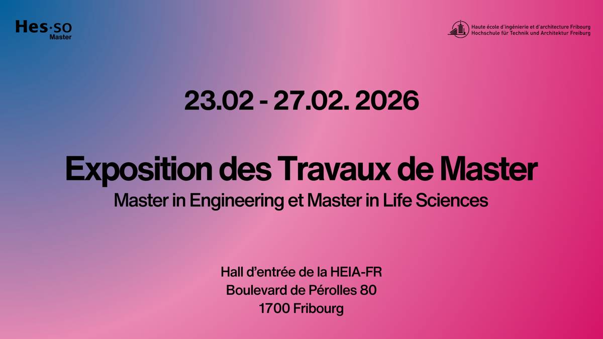 L'exposition des travaux de Master in Engineering (MSE) et Master in Life Sciences (MLS) offre l'opportunité de découvrir des projets innovants et d'échanger avec les étudiant·es. Des posters seront affichés dans le hall d'entrée de la HEIA-FR tout au long de la semaine et chaque jour, les diplômant·es seront sur place de 11h15 à 12h00 pour présenter leurs travaux de Master (sur inscription).