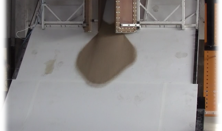 The research will be performed on a large physical model (4 x 6 m in size) allowing the release of dry granular materials on a slope ending with a horizontal accumulation area. Several testing parameters can be varied: material used (gravel, small bricks), release height, volume and release sequence (at once or at different times), inclination of the slope, surface roughness and morphology of the transition between the panels (sharp angular or curved). The foreseen experimental study will focus on assessing the influence of the initial geometry of the mass at start (width, height, inclination of the basal plane) on the propagation, lateral spreading and runout distance. It will take advantage of recent improvements to the releasing device and the measurement system. The former consists of a wood container with variable width and height and with a basal plane that can be inclined with respect to the dip angle of the slope below. The latter consists of two synchronised high-resolution and high-speed cameras to allow a stereoscopic reconstruction of the mass morphology during the whole motion. In addition to the experiments, numerical modelling will help to understand the mechanisms of propagation, the loss of energy and the transfer of momentum along the path.