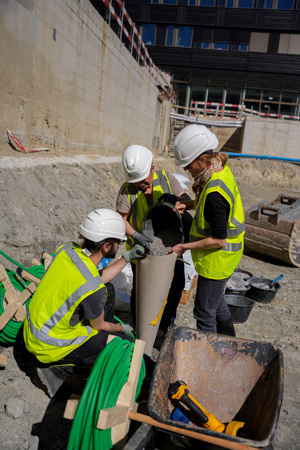 L'autre enjeu est de garantir une protection optimale du bâtiment contre les risques d'infiltration à l'aide de technique constructives recommandées en Suisse. La mise en œuvre de ces méthodes en collaboration avec le groupe JPF en charge de la direction des travaux vise à offrir aux entreprises de forage, aux fournisseurs d'énergie ainsi qu'aux constructeurs des cés de compréhension pour le futur. Le but est d'élaborer des bonnes pratiques en vue d'une démarche intégrée et durable de l'exploitation de la géothermie tout en assurant de manière systématique la protection du parc immobilier donc de la population.