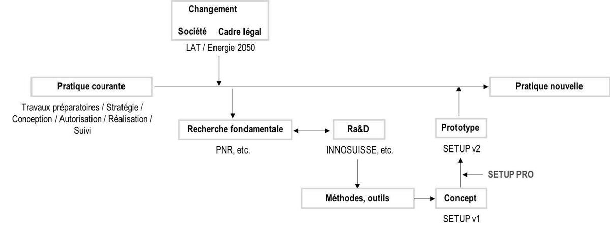 Le projet SETUP PRO s’inscrit dans la dynamique de l’interaction entre l’évolution de la société et la pratique urbanistique. Un changement de fond ou une tendance forte présente dans la société provoque un changement du cadre légal (par ex. LAT et LEne); des recherches fondamentales liées à ces thématiques nourrissent la réflexion et génèrent des nouvelles connaissances qui, à leur tour, sont la base de projets Ra&D; il en résulte des nouvelles méthodes et outils adéquats au nouveau paradigme, d’abord comme “outil - concept” (SETUP v1) et ensuite comme “outil - opérationnel” (SETUP v2).