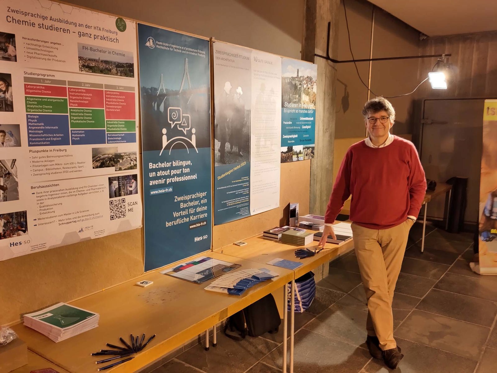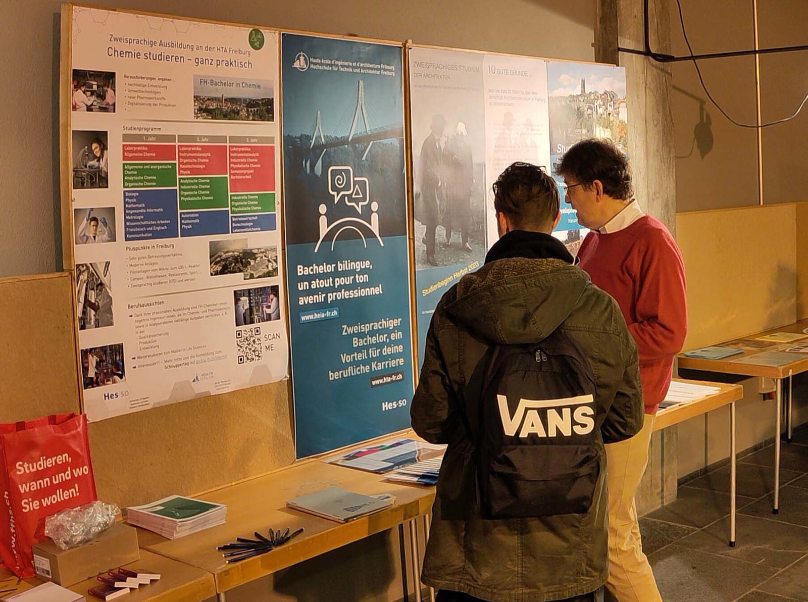 In der ersten Ausgabe der FH/HF-Messe im Lichthof des Berufsbildungszentrums Schaffhausen haben Fachhochschulen und höhere Fachschulen aus der ganzen deutschsprachigen Schweiz ihre Ausbildungen präsentiert. Auch die HTA-FR war mit einem Stand vertreten, an dem sich mehrere Maturanden (BM oder FM) über die zweisprachigen Studiengänge informiert haben.