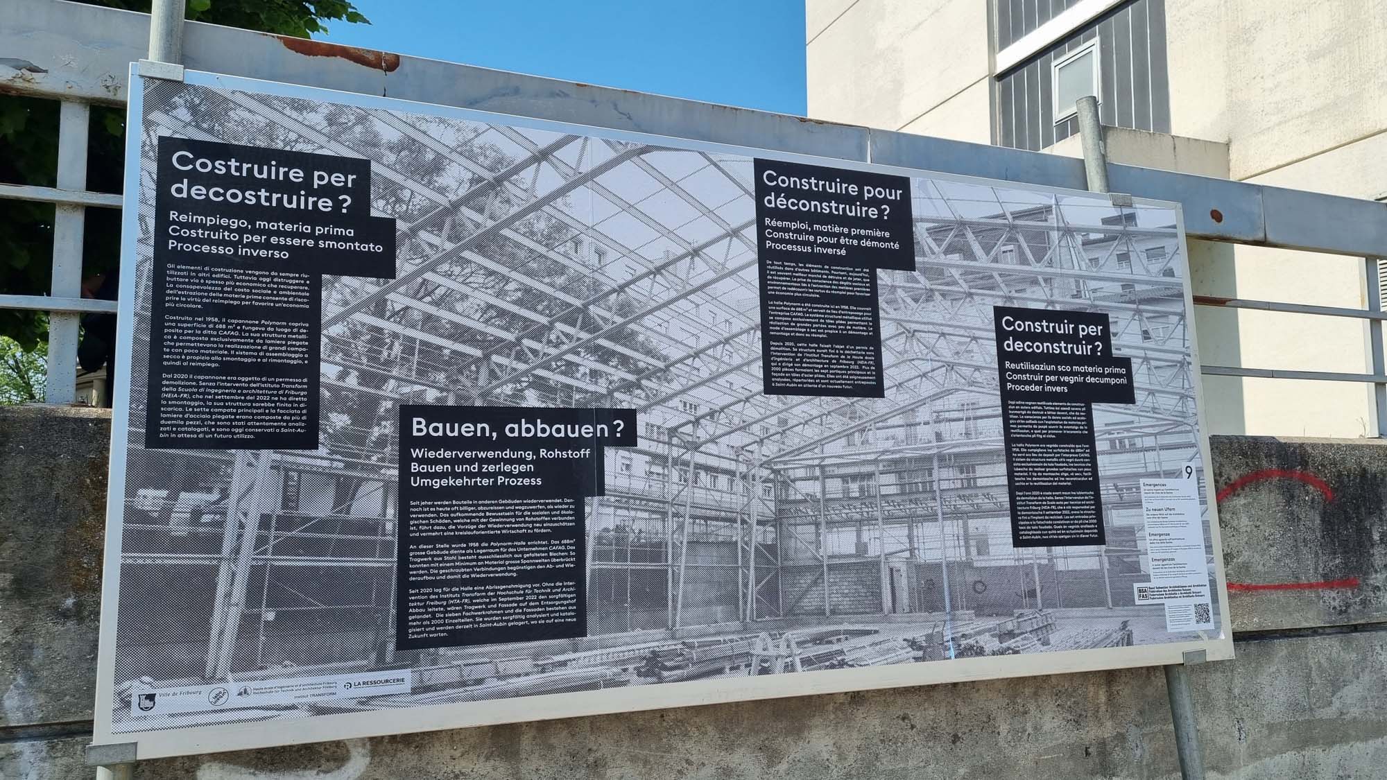 On Friday, June 2nd, 2023, the Federation of Swiss Architects (FAS) held its general assembly in Fribourg. On the occasion, the 2023 FAS Prize was awarded to La Ressourcerie for making key contributions to construction material reuse practices. The TRANSFORM institute is proud to have supported La Ressourcerie’s expanding role in the area of deconstruction-reconstruction by partnering with them in the project to disassemble the POLYNORM hall (formerly CAFAG). Several TRANSFORM projects and institute members were further recognized in the FAS event by being featured in a billboard campaign. Organized as a walking tour through the city of Fribourg, a series of billboards presents important current topics in architecture that are also part of the architecture curriculum at the School of Engineering and Architecture of Fribourg (HEIA-FR). These include the right to housing and its promotion through housing cooperatives; the renovation and transformation of existing buildings and the resulting high demands in terms of architectural quality; key issues surrounding energy efficiency and the use of low tech; the importance of building culture; the regenerative value of unused urban plots; the opportunities and challenges involved in deconstruction and in the reuse of construction waste; and the impact of water course revitalization and natural areas in the city.