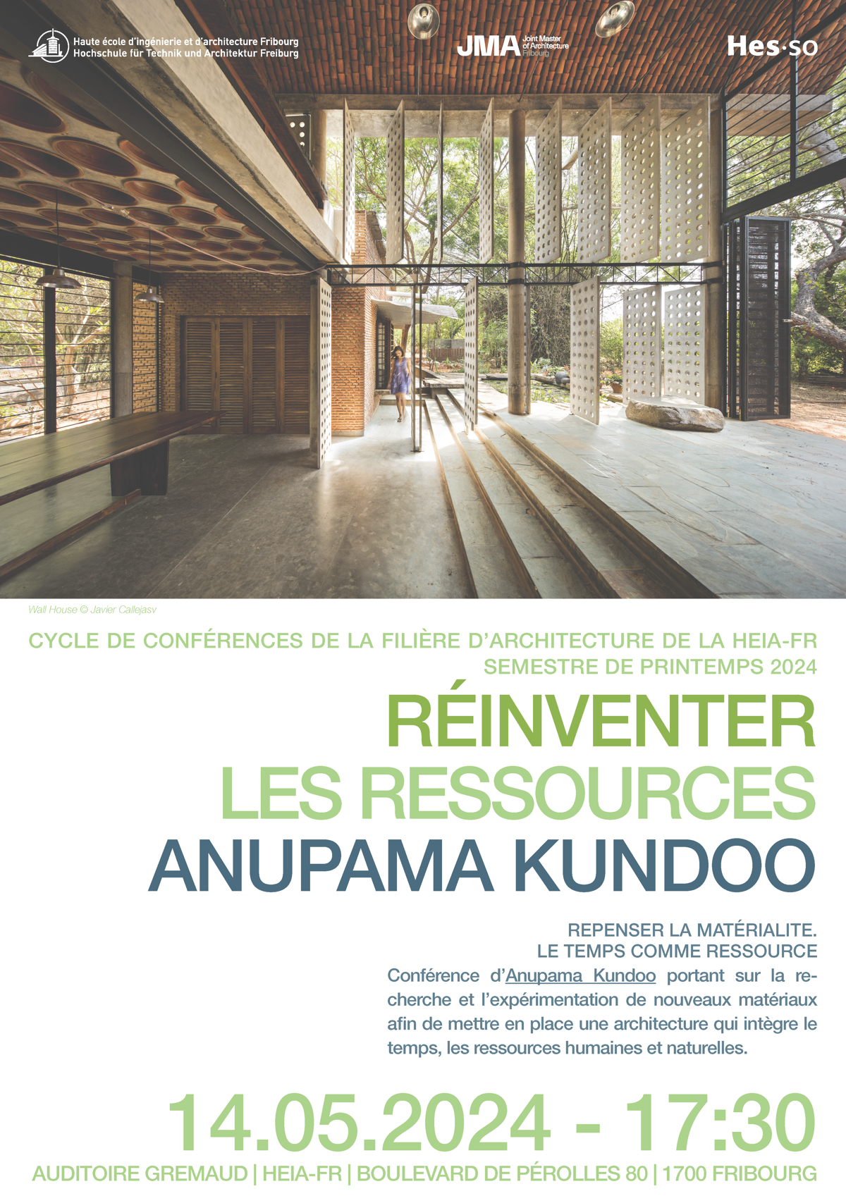 Intitulée « Repenser la matérialité. Le temps comme ressource », cette conférence d'Anupama Kundoo porte sur la recherche et l'expérimentation de nouveaux matériaux afin de mettre en place une architecture qui intègre le temps, ainsi que les ressources humaines et naturelles.