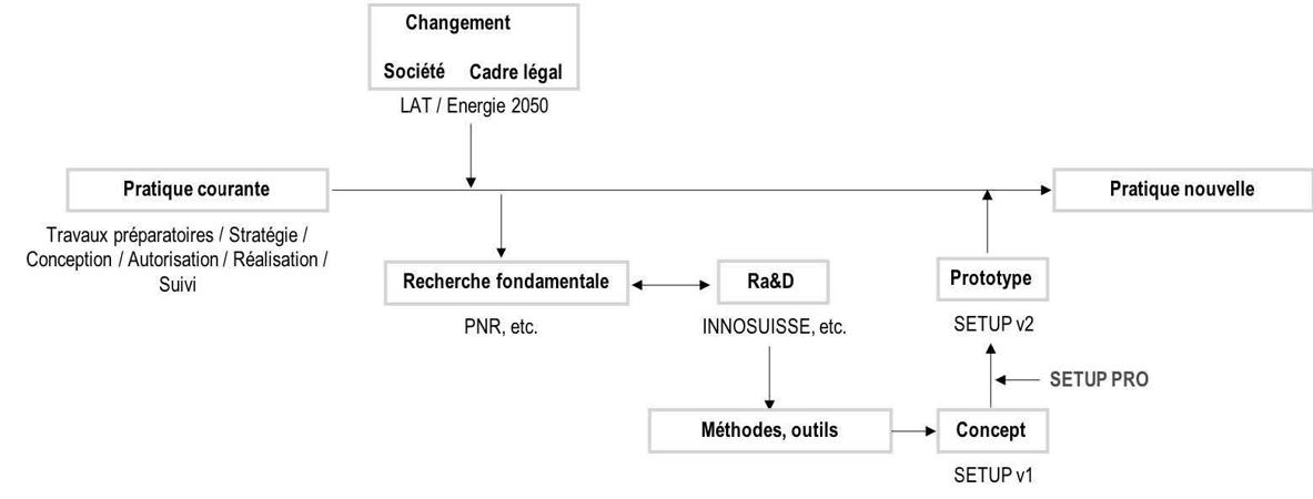 Le projet SETUP PRO s’inscrit dans la dynamique de l’interaction entre l’évolution de la société et la pratique urbanistique. Un changement de fond ou une tendance forte présente dans la société provoque un changement du cadre légal (par ex. LAT et LEne); des recherches fondamentales liées à ces thématiques nourrissent la réflexion et génèrent des nouvelles connaissances qui, à leur tour, sont la base de projets Ra&D; il en résulte des nouvelles méthodes et outils adéquats au nouveau paradigme, d’abord comme “outil - concept” (SETUP v1) et ensuite comme “outil - opérationnel” (SETUP v2).