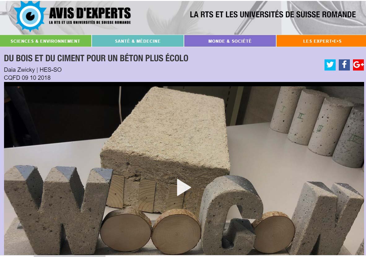 Le projet WooCon (Wood based Concrete) est développé par l’équipe du professeur Daia Zwicky depuis 2012. Son objectif est de créer un nouveau matériau de construction sur la base de bois et d’autres composants organiques et du ciment qui soit plus léger et moins énergivore que le béton traditionnel.