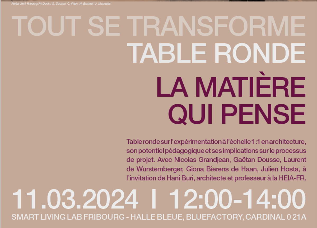 Le professeur Hani Buri invite cinq intervenant.e.s qui ont expérimenté l’Atelier PopUp à partager leurs expériences. Cette rencontre s’inscrit dans le cadre du projet « Tout se transforme », en partenariat avec l’institut TRANSFORM, la filière d’architecture de la HEIA-FR, la revue TRACES et le Smart Living Lab.