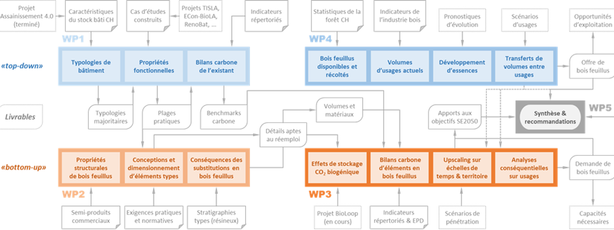 Ce projet veut explorer les contributions potentielles aux objectifs de la Stratégie énergétique 2050 d'une exploitation meilleure, voire maximale, des bois feuillus suisses dans la construction des bâtiments. Ou alors, quantifier la réponse à la question si la construction en bois peut résoudre les défis de la décarbonation à net-zéro, en prenant aussi compte des demandes d'autres utilisations (ex. mobilier, chaudière, papier etc.) dans la comparaison à l'offre potentielle de bois feuillus sur l'échelle temporelle et territoriale.
