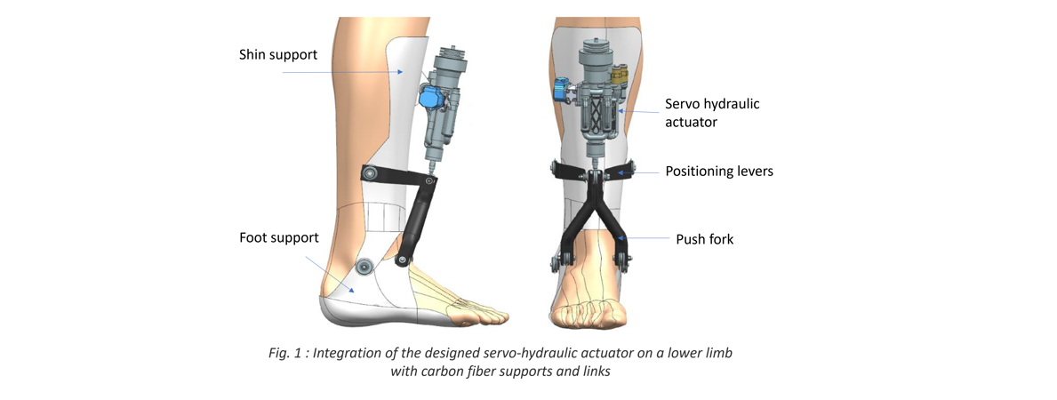 The aim of the project was to study the engineering feasibility of a motorized ankle-foot orthosis for use in rehabilitation therapy (s. Fig. 1 above). More specifically, the project focused on the development of a hydraulic actuation system for an ankle exoskeleton capable of delivering a peak power of 250 W, with a maximum torque of 90 N.m and a maximum angular speed of 320 degrees per second. The question we wanted to answer was “How far could we reduce the weight of such a hydraulically-operated orthosis without sacrificing dynamics or power?”